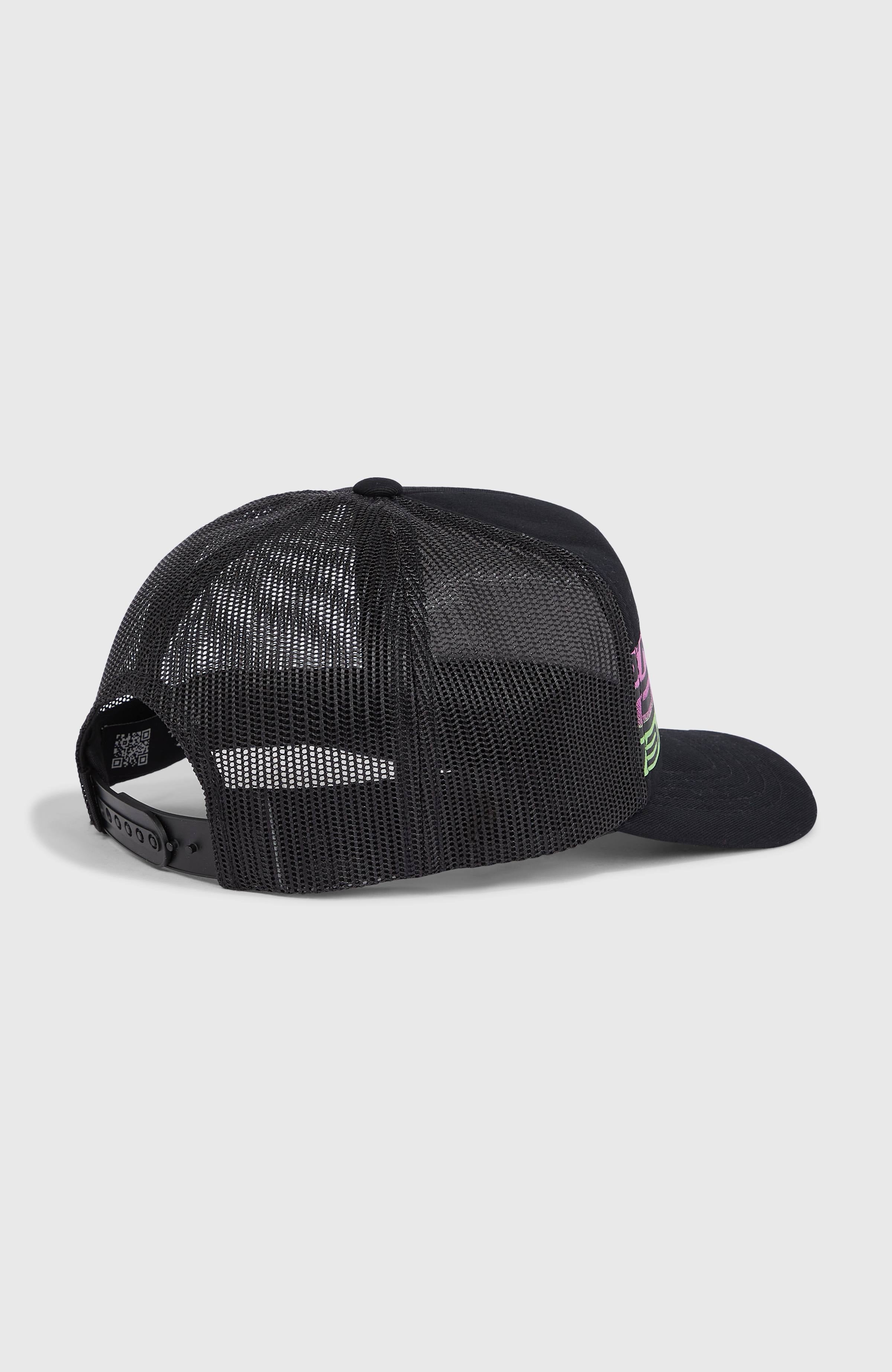 The Flood Trucker Cap features a colourful badge logo on the front. This six-panel trucker-style cap has a curved visor, inner tape, and breathable recycled polyester mesh rear panels. It includes a snapback closure for an adjustable fit and is made with 100% cotton.