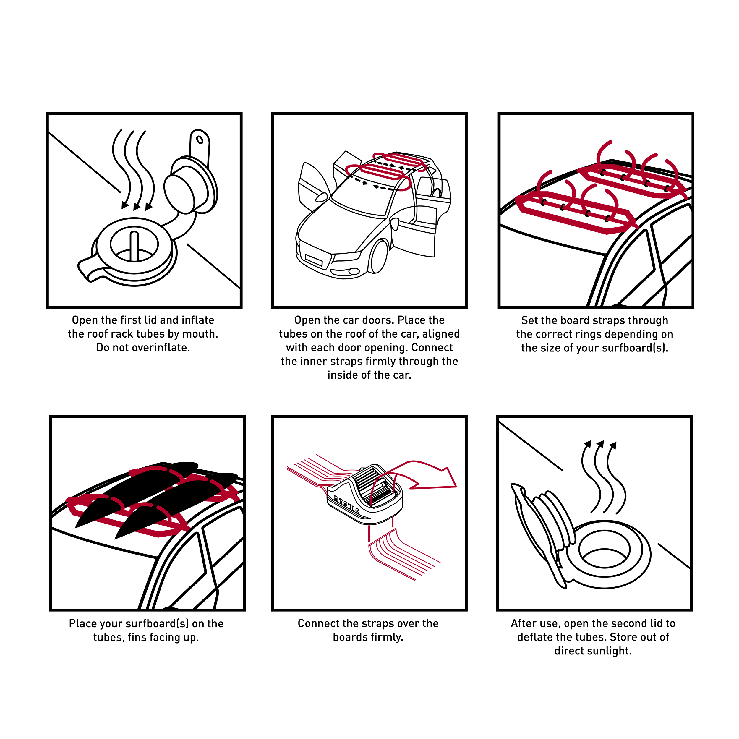For all those times you wish you had a roofrack. The Inflatable Roofrack System is quick to assemble with a simple oral inflation valve, transforming your car in minutes. After use, simply deflate to a compact size, tuck it into the included storage bag, and take it anywhere. The design includes multiple securing loops and four durable 225cm nylon straps with scratch-resistant cam buckles, making it a cinch to fasten your boards and hit the road. Whether it's a rental or your own ride, your next adventure starts here. The Double version is wide enough to fit two stacks of boards.